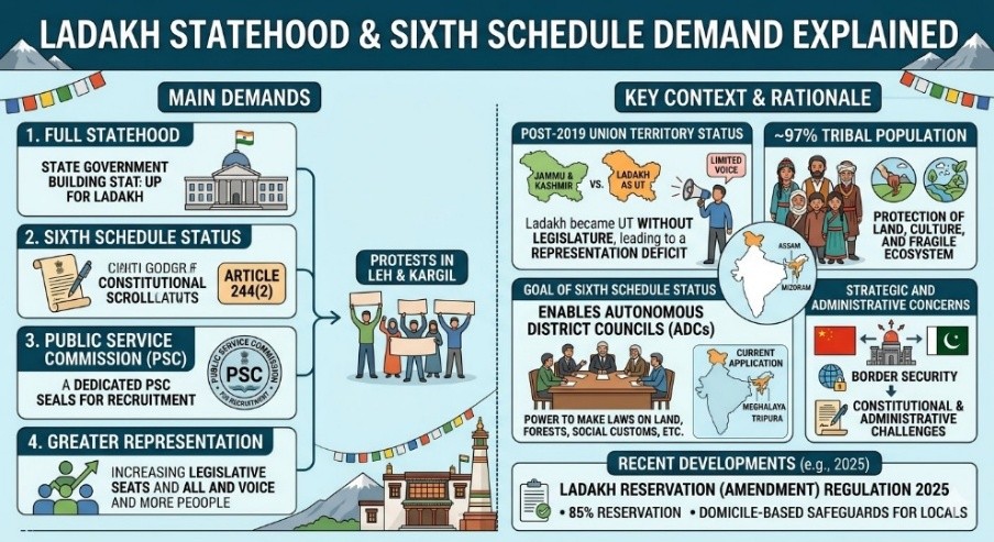 - Protests in Leh and Kargil demanded the statehood, Sixth Schedule status, Public Service Commission (PSC), and greater representation for Ladakh.