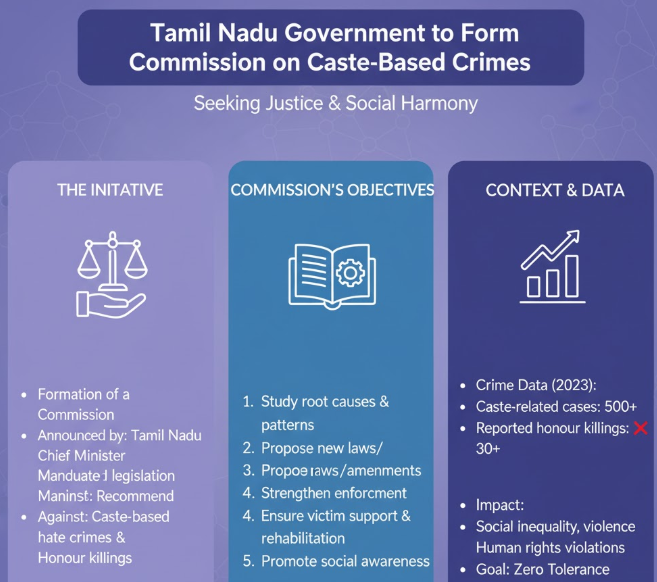 - Tamil Nadu Chief Minister announced the formation of a Commission to recommend legislation against caste-based hate crimes and honour killings.