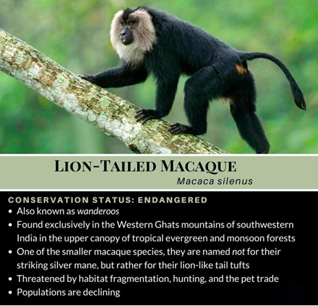 - The lion-tailed macaque is an endemic primate species found only in the Western Ghats rainforest ecosystem.