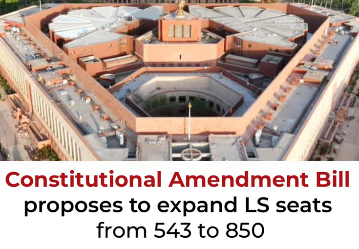 - The Government of India proposed to expand the strength of the Lok Sabha from 543 to 850 seats through a Constitutional Amendment.