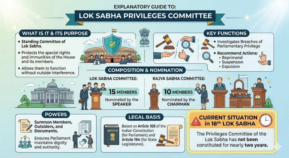 The Privileges Committee of the Lok Sabha (the lower house of India’s Parliament) has not been constituted for nearly two years in the 18th Lok Sabha.