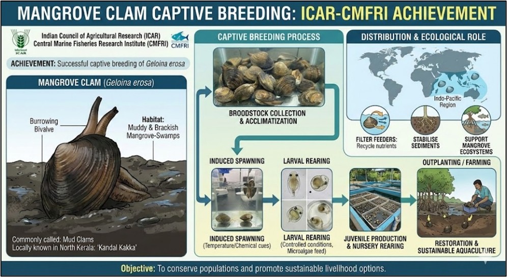 Recently, the Indian Council of Agricultural Research (ICAR)–Central Marine Fisheries Research Institute (CMFRI) achieved captive breeding of the mangrove clam Geloina erosa.