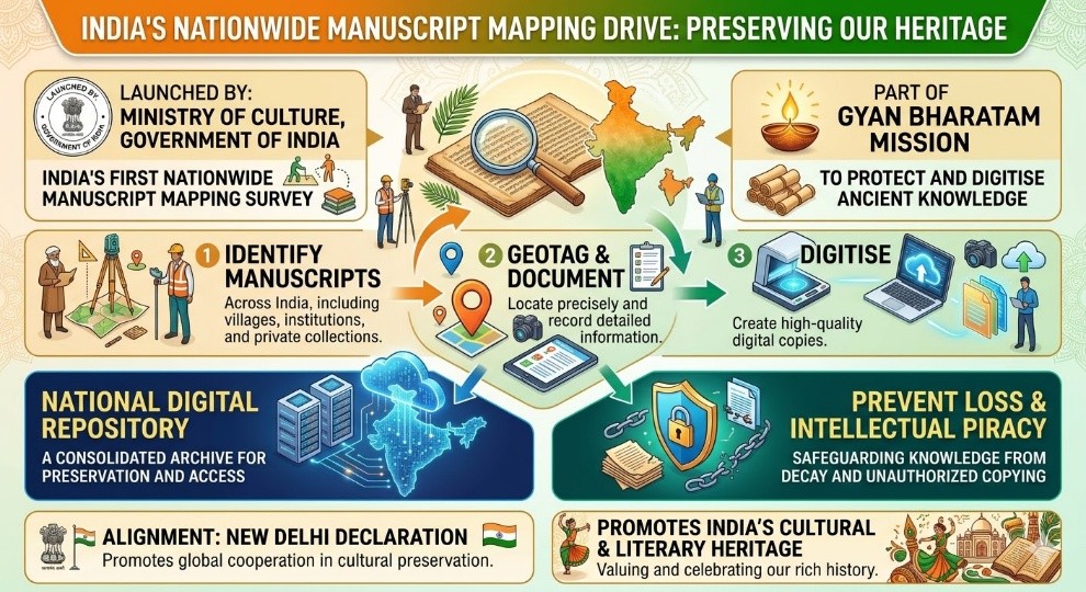 - The Ministry of Culture launched India’s first nationwide manuscript mapping survey to preserve heritage.
