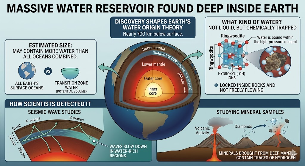 Scientists have discovered a huge water reservoir nearly 700 km below Earth’s surface inside the mantle, changing ideas about Earth’s water origin.