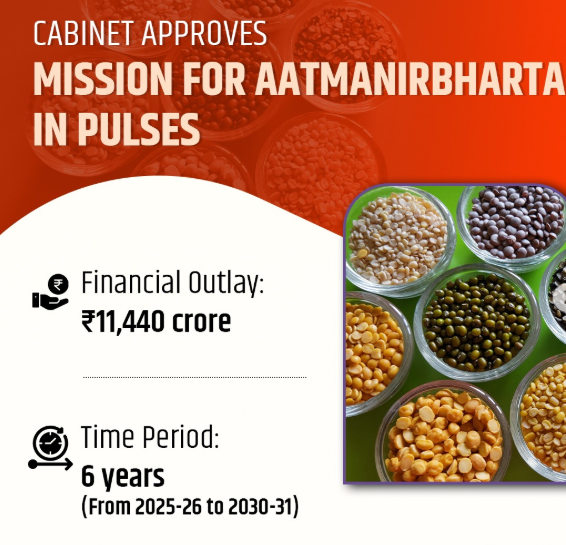 Cabinet approved a six-year mission for self-reliance in pulses with a total outlay of ₹11,440 crore.