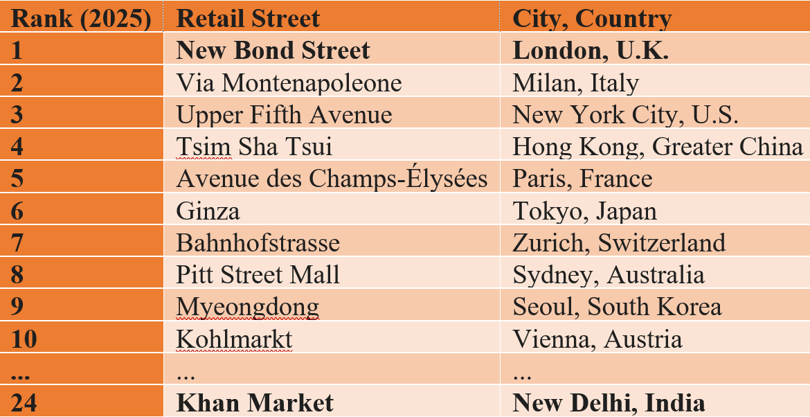 - Khan Market in New Delhi ranked 24th with an annual rent of 223 US dollars per square foot and 3 % growth.