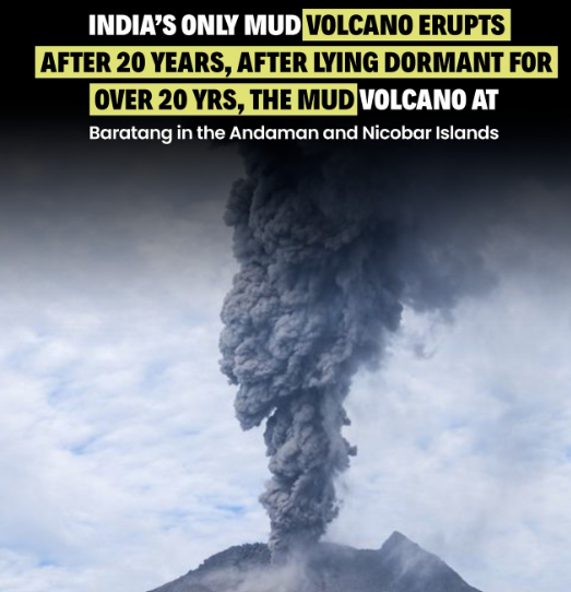 - India’s only mud volcano at Baratang in the Andaman and Nicobar Islands erupted on October 2, 2025.