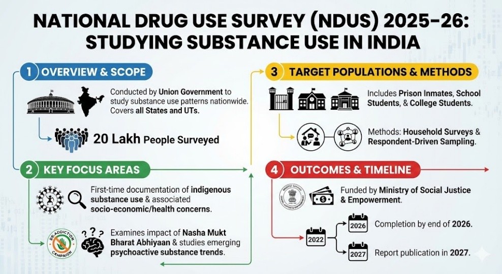 • The Union government will conduct the National Drug Use Survey (NDUS) 2025–26 to study substance use patterns across India.