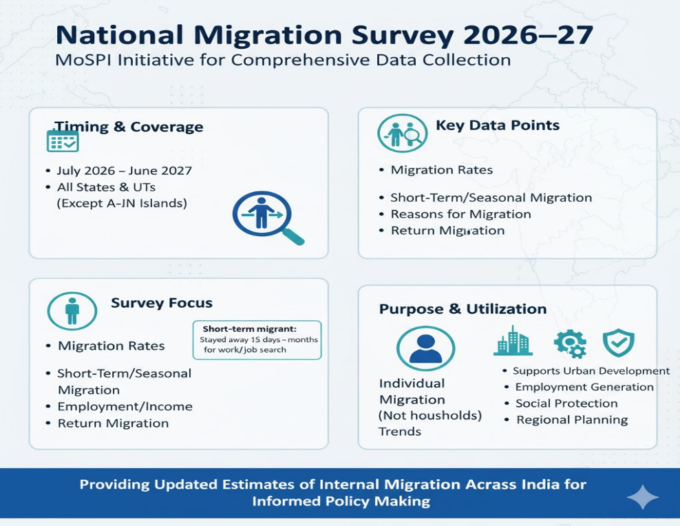 The Ministry of Statistics and Programme Implementation (MoSPI) will conduct the National Migration Survey from July 2026 to June 2027.