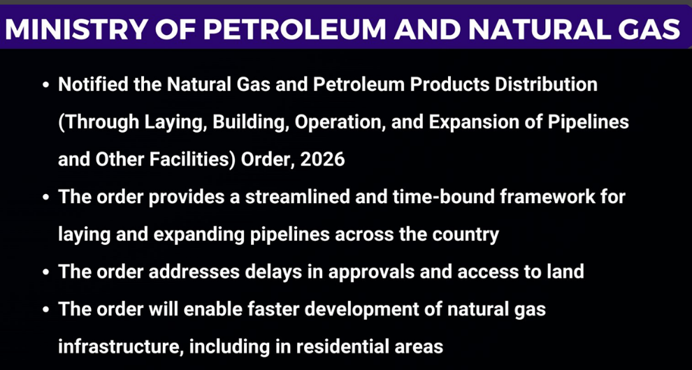- The government notified the Natural Gas and Petroleum Products Distribution Order, 2026, under the Essential Commodities Act, 1955, to expand gas use.