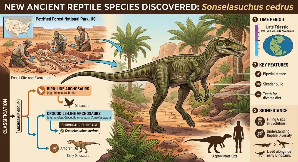 • Scientists discovered a new ancient reptile species named Sonselasuchus cedrus that lived about 225–201 million years ago during the Late Triassic period.