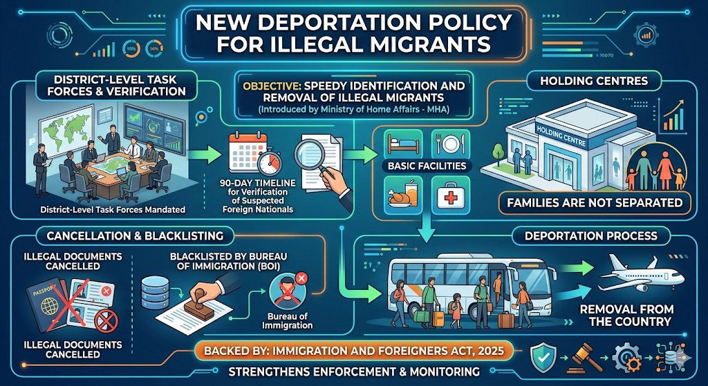 - The Ministry of Home Affairs (MHA) introduced a new deportation policy to speed up the identification and removal of illegal migrants.
