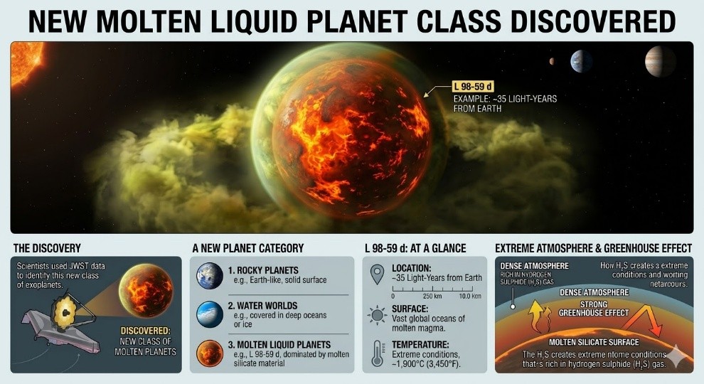 - The Scientists have discovered a new class of molten liquid exoplanets using the James Webb Space Telescope.