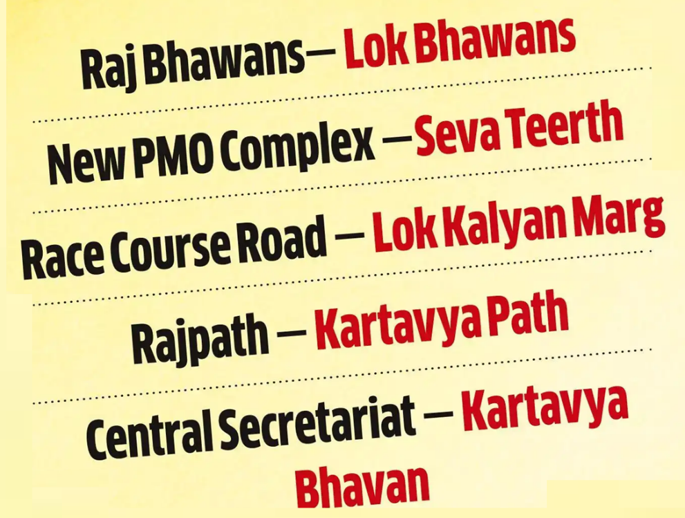 - Other recent renaming includes Raj Bhavans to Lok Bhavans, Rajpath to Kartavya Path, and the PM’s residence road to Lok Kalyan Marg.