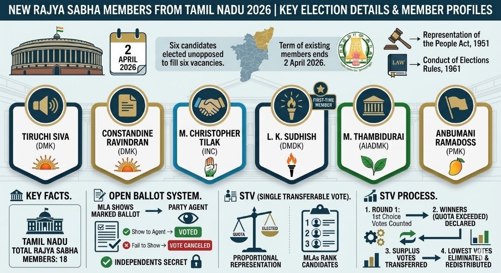 Six candidates have been elected unopposed to the Rajya Sabha from Tamil Nadu to fill six vacancies as the term of existing members ends on 2 April 2026.