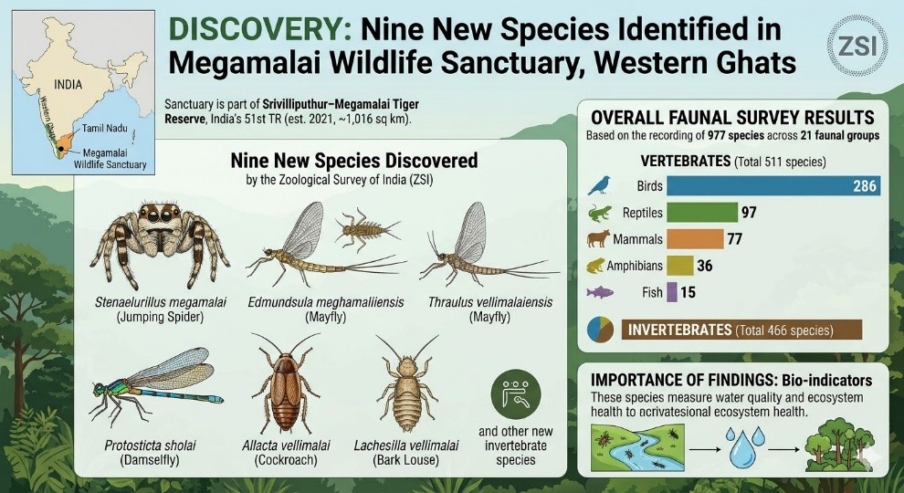The Zoological Survey of India (ZSI) discovered nine new species during a faunal survey at Megamalai Wildlife Sanctuary in the Western Ghats.