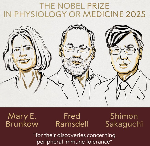Mary E. Brunkow, Fred Ramsdell, and Shimon Sakaguchi have been awarded the 2025 Nobel Prize in Physiology or Medicine.
