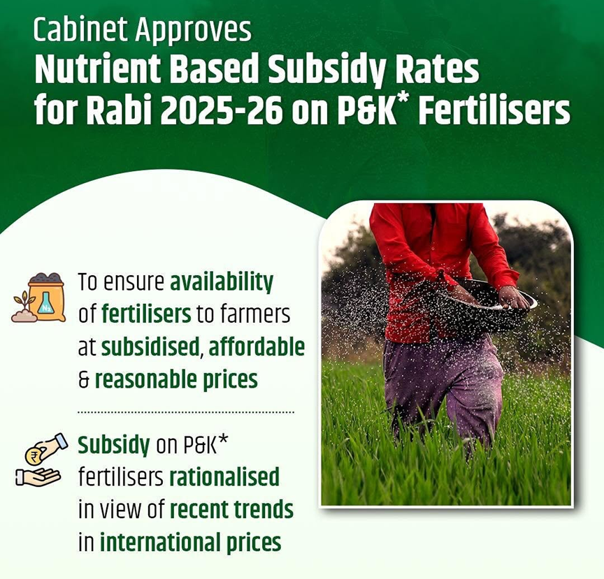 - The Union Cabinet has approved the Nutrient Based Subsidy (NBS) rates for Phosphatic and Potassic (P&K) fertilizers for Rabi 2025–26.