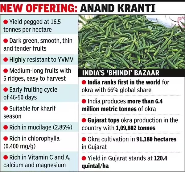 - In 2024–25, okra was grown on 14,000 hectares in 12 districts of Saurashtra and Kutch, yielding 1.5 lakh tonnes.