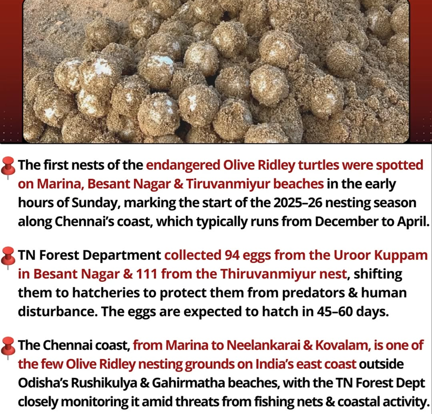 - Hatcheries for Olive Ridley sea turtle nesting have been set up in Chennai for the 2025–26 nesting season.