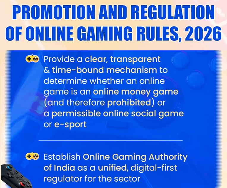 - The Government of India notified the Promotion and Regulation of Online Gaming Rules, 2026, effective from next month.