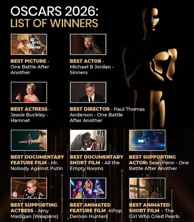 - The winners of the 98th Academy Awards (Oscars 2026) were announced in Los Angeles, United States.