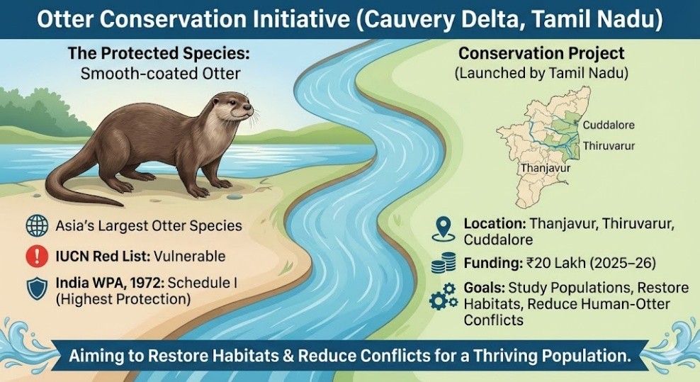 - Tamil Nadu launched a programme to protect the smooth-coated otter in the Cauvery Delta.