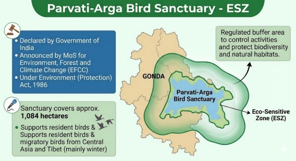 - The Government of India has declared the Parvati-Arga Bird Sanctuary in Gonda district, Uttar Pradesh, as an Eco-Sensitive Zone (ESZ).