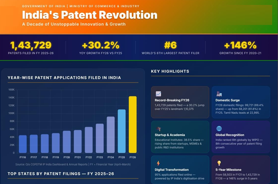 - India recorded a 30.2% rise in patent applications, reaching 1,43,729 in FY 2025–26.