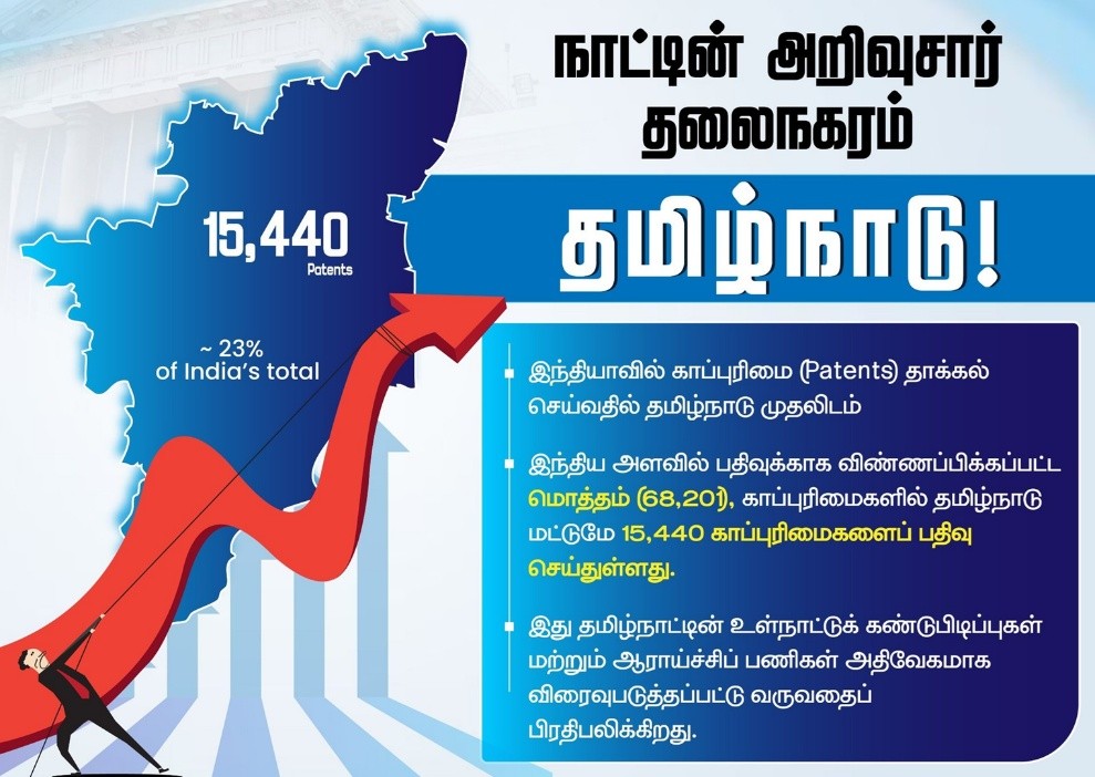 - Tamil Nadu filed 15,440 patent applications in the year 2024–25.