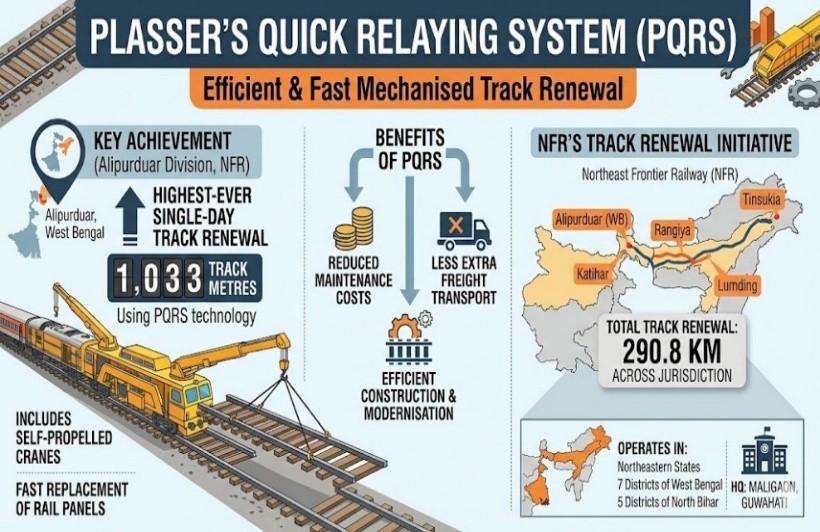 • The Alipurduar Division of Northeast Frontier Railway (NFR) achieved its highest-ever single-day mechanised track renewal of 1,033 track metres using Plasser’s Quick Relaying System (PQRS).