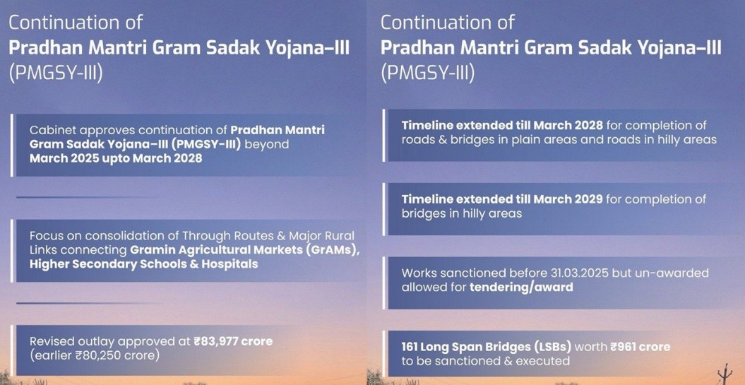 - Union Cabinet extended Pradhan Mantri Gram Sadak Yojana-III (PMGSY-III) till March 2028.