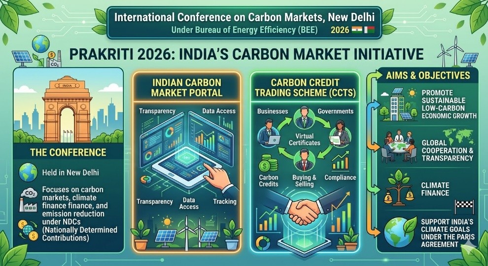 - The International Conference on Carbon Markets, “Prakriti 2026,” was held in New Delhi under the Bureau of Energy Efficiency (BEE).