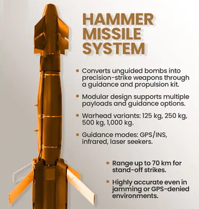 HAMMER can be used from stand-off ranges and is integrated with Rafale and planned for Tejas aircraft.