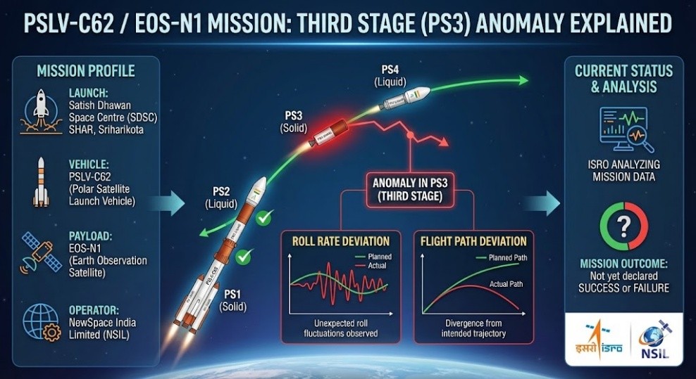 - The ISRO reported a technical anomaly in the PS3 (third stage) of the PSLV-C62 rocket during the EOS-N1 mission.