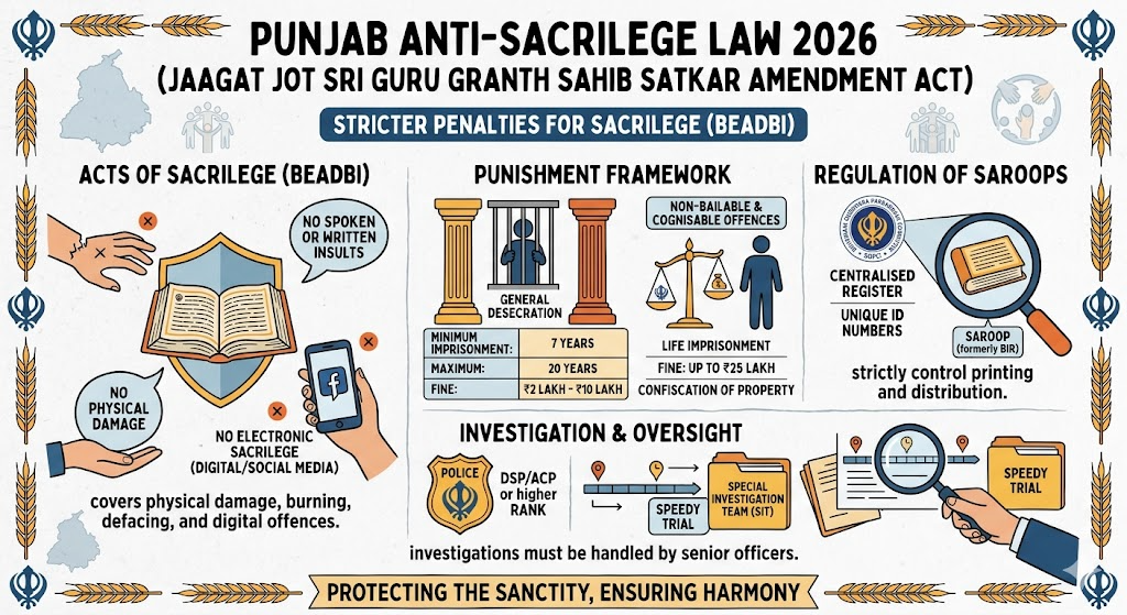 - It makes sacrilege (beadbi) of Sri Guru Granth Sahib a punishable offence under a stricter legal framework.