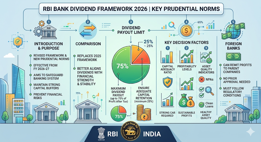 - Reserve Bank of India revised the bank dividend framework and introduced new prudential norms effective from Financial Year 2026–27.