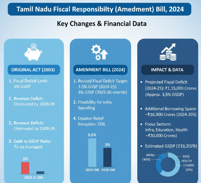 The original targets under the Tamil Nadu Fiscal Responsibility Act were enacted in alignment with the national framework for fiscal discipline under the Fiscal Responsibility and Budget Management (FRBM) Act, 2003, and successive Finance Commission recommendations.