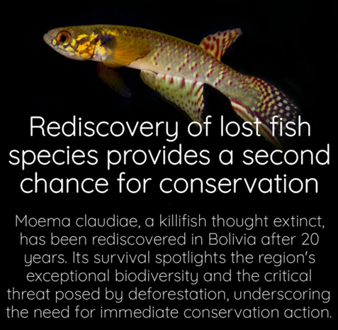 - Moema claudiae, a seasonal killifish species, was rediscovered in Bolivia.