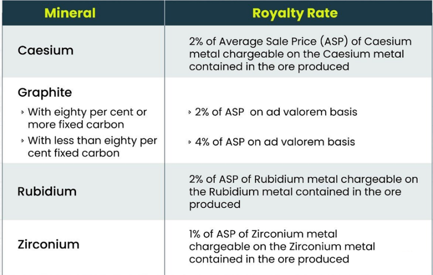 Caesium and Rubidium will have a 2% royalty on the average sale price (ASP) of the metal contained in the ore, Zirconium 1%, and Graphite 2–4% depending on carbon content.