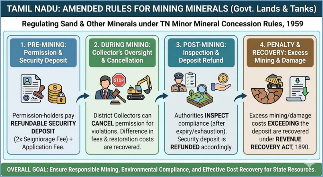 The Tamil Nadu government amended the Tamil Nadu Minor Mineral Concession Rules, 1959, to regulate mining of sand and other minerals from government lands and tanks.