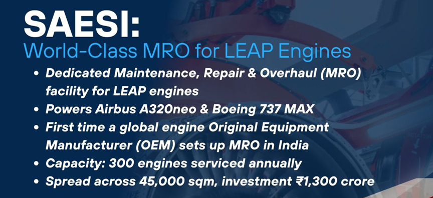 SAESI is one of the largest global aircraft engine Maintenance, Repair, and Overhaul (MRO) facilities and the first global engine Original Equipment Manufacturer (OEM) operation in India.
