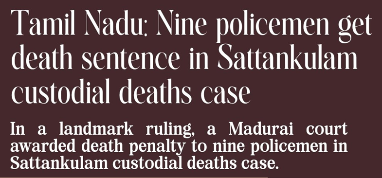 - A trial court in Madurai awarded the death penalty to nine policemen in the Sattankulam custodial deaths case.