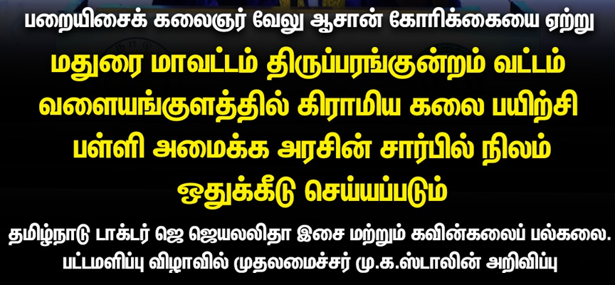 Tamil Nadu government will give land to start a training school for traditional folk-art forms at Valayangulam village in Thiruparankundram taluk, Madurai.
