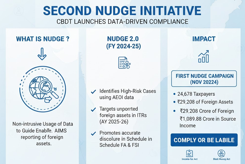 The first NUDGE campaign (November 2024) resulted in 24,678 taxpayers disclosing ₹29,208 crore of foreign assets and ₹1,089.88 crore of foreign-source income.