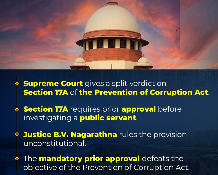 • The Supreme Court of India delivered a split verdict on the constitutional validity of Section 17A of the Prevention of Corruption Act, 1988.