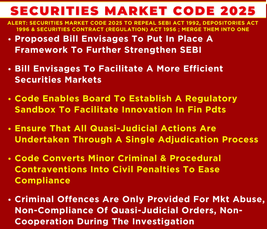 It merges the Securities and Exchange Board of India Act, 1992; the Depositories Act, 1996; and the Securities Contracts (Regulation) Act, 1956 into one code.
