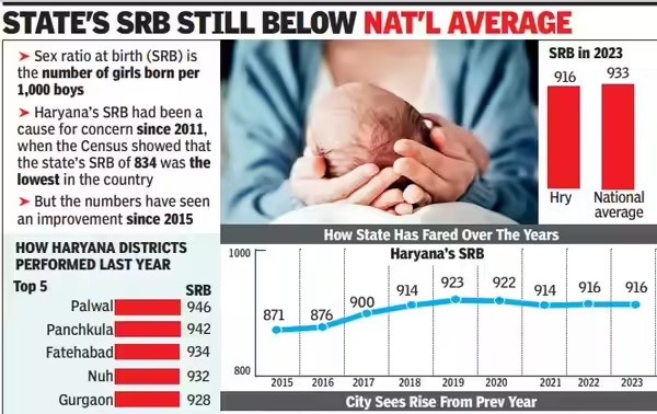 - Haryana recorded a Sex Ratio at Birth (SRB) of 923 in 2025, which is the highest in the last five years.
