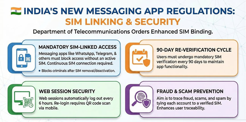 The Department of Telecommunications (DoT) has directed messaging apps, including WhatsApp, Telegram, Signal, and Snapchat, to implement mandatory SIM binding within 90 days.