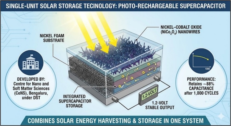 - Indian scientists developed a device that can capture and store solar energy in one unit.